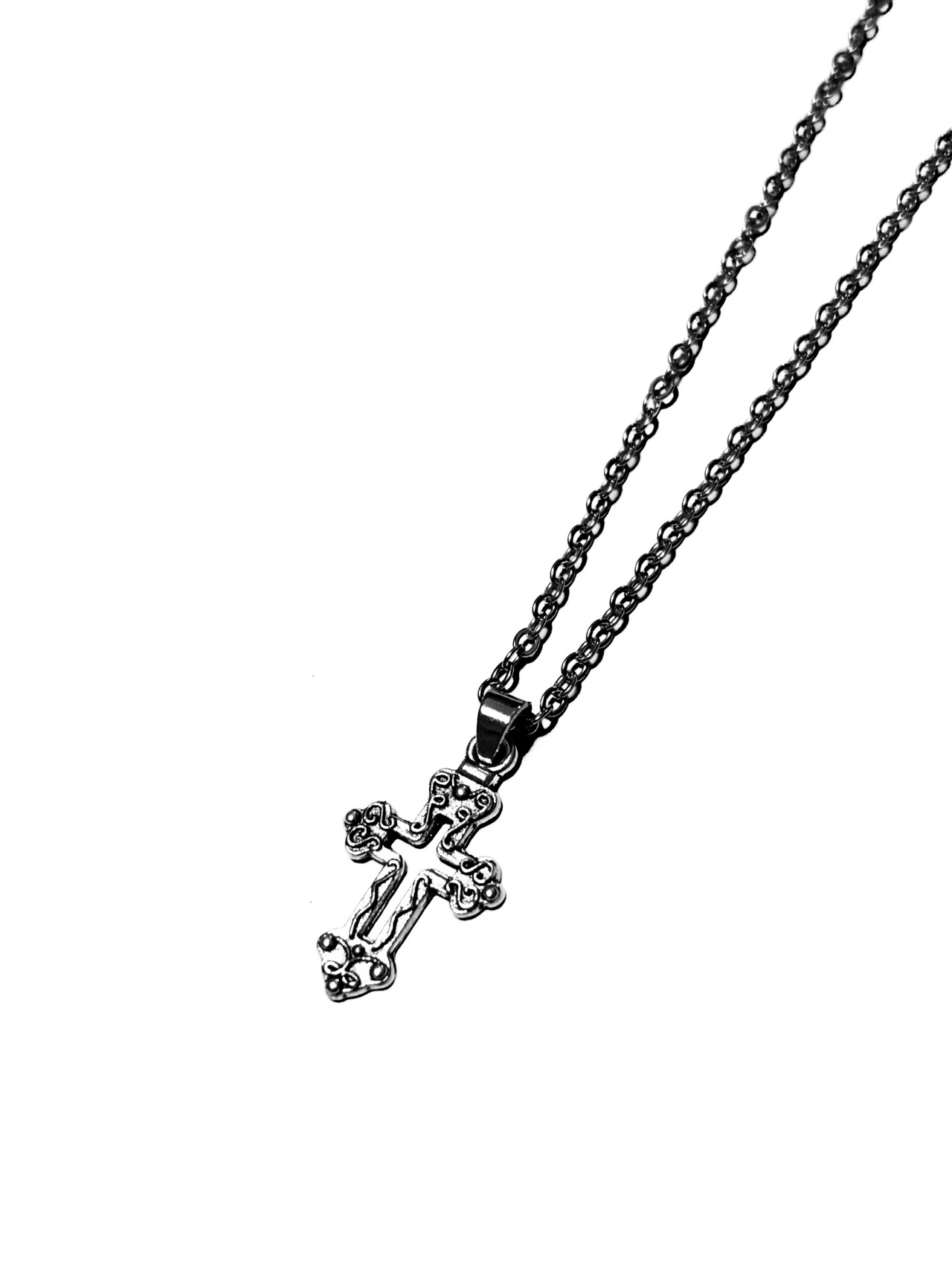チェーン長さ50㎝ 素材: ステンレス、チャーム素材: 亜鉛合金 デザイン詳細: 精緻な装飾の十字架モチーフ