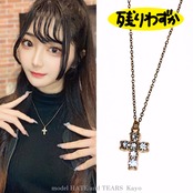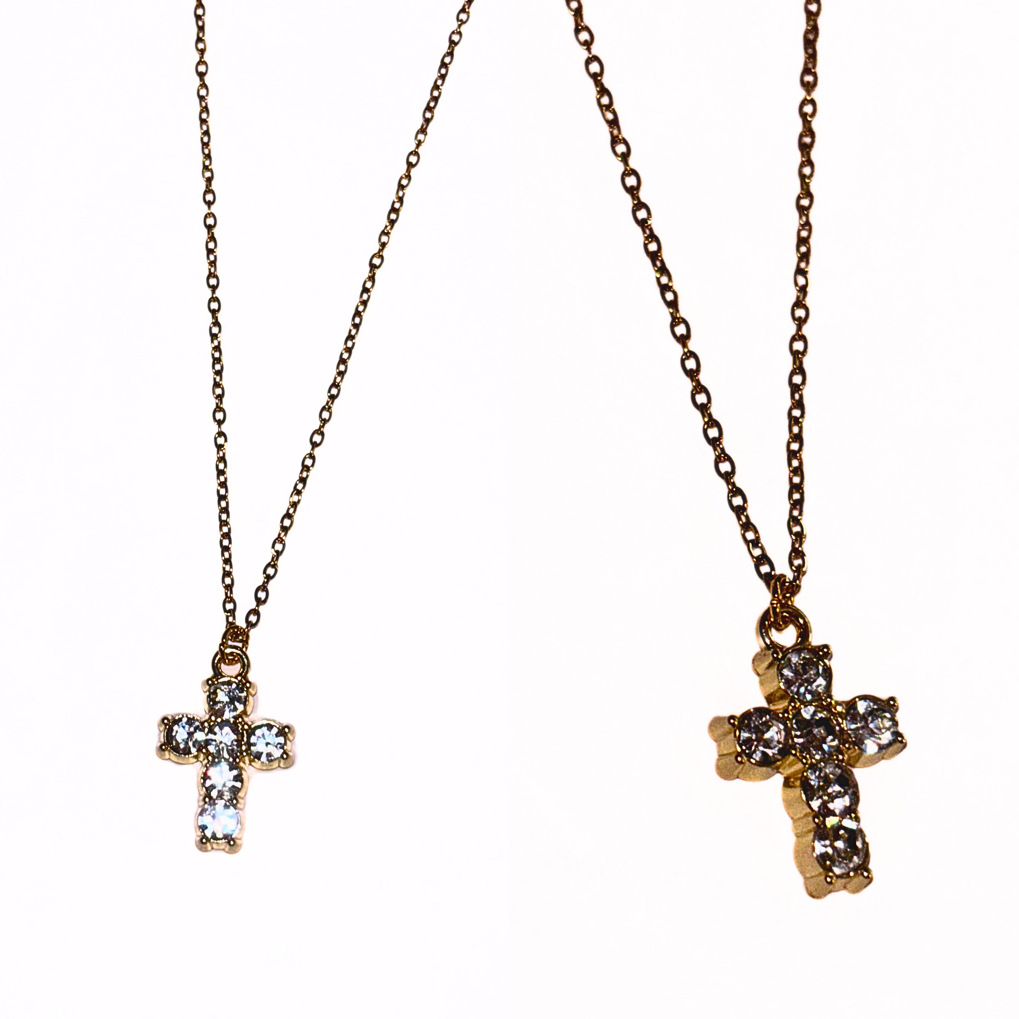 美しいゴールドのクロスネックレス。ラインストーンの輝きが際立つデザインで、どんなシーンにも華やかさを添えます。クロスの形状は、シンプルでありながらも存在感があり、身に着けることで特別な意味を持つアイテムとなります。光を受けるたびにその美しさが引き立ちます。